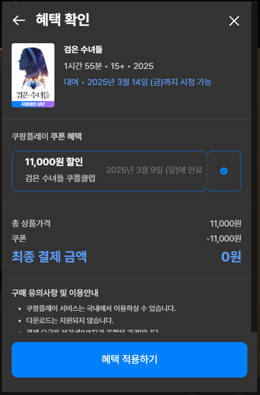 또한 송혜교 배우가 11년 만에 스크린에 복귀하는 기대작이었던 <검은 수녀들>이 3/7일 부터 일주일간, 쿠팡 와우 회원이라면 무료로 볼 수 있는 이벤트를 진행중이다.